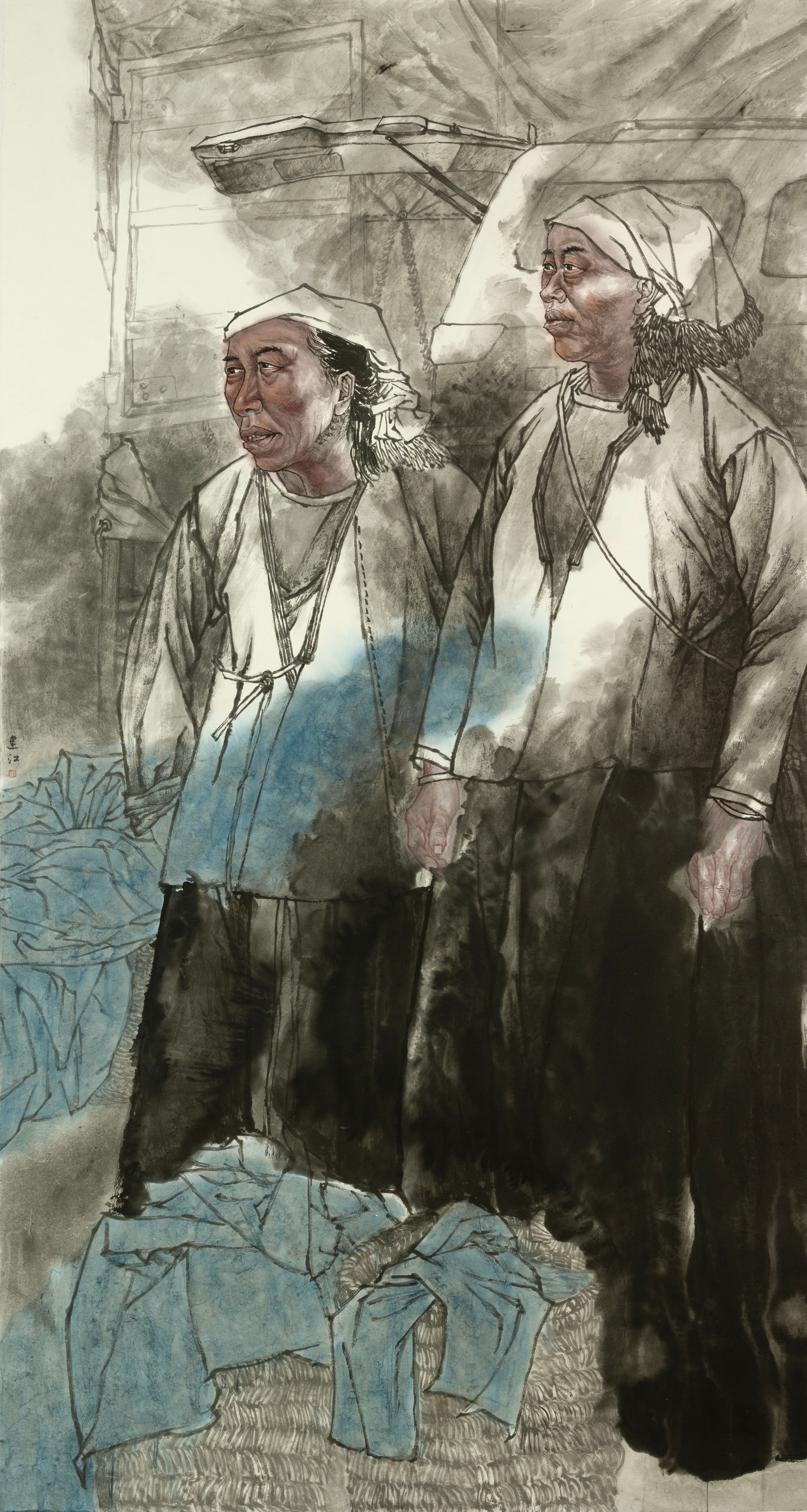 本作品以广西隆林德峨偏苗妇女赶圩场景为题材,作品以“劳动尊严”与“文化坚守”为双重主题,借队列式四位偏苗妇女形象暗喻文化传承,借助晨雾与朝晖的光影设计,将日常劳作升华为具有仪式感的文化隐喻。艺术表现上,创新采用未提炼靛青泥与矿物颜料混合的技法,探索传统染料的当代应用,营造斑驳厚重的岩彩肌理与历史纵深感,通过“在地性”材质创新与符号转译,以及光影的运用,为中国人物画注入现代语言。