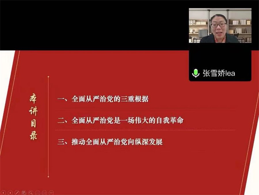 宣讲报告会以《坚定不移 全面从严治党》为题对党的二十大精神进行了系统阐释和深入解读。张雪娇分别从“全面从严治党的三重根据”“全面从严治党是一场伟大的自我革命”“推动全面从严治党向纵深发展”三方面深入解读党的二十大精神,深刻领悟党中央关于坚定不移全面从严治党的丰富内涵和重大意义,领会从严治党是中国共产党建设的突出特点和光荣传统。宣讲报告中对党的十八大以来全面从严治党五个重要时间节点、习近平总书记重要讲话内容及精神进行了集中梳理,系统简要宣讲全面从严治党取得的伟大成效。