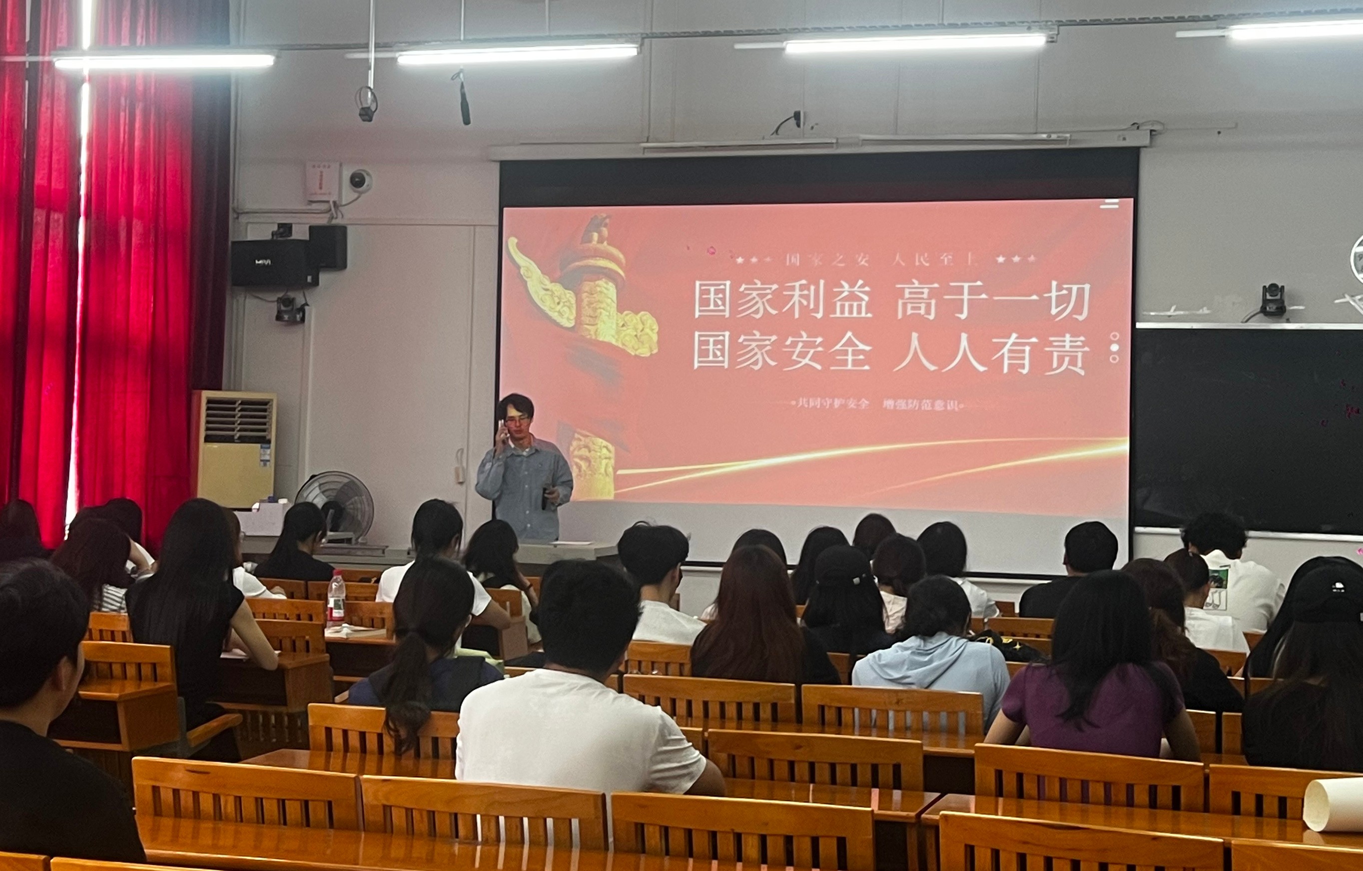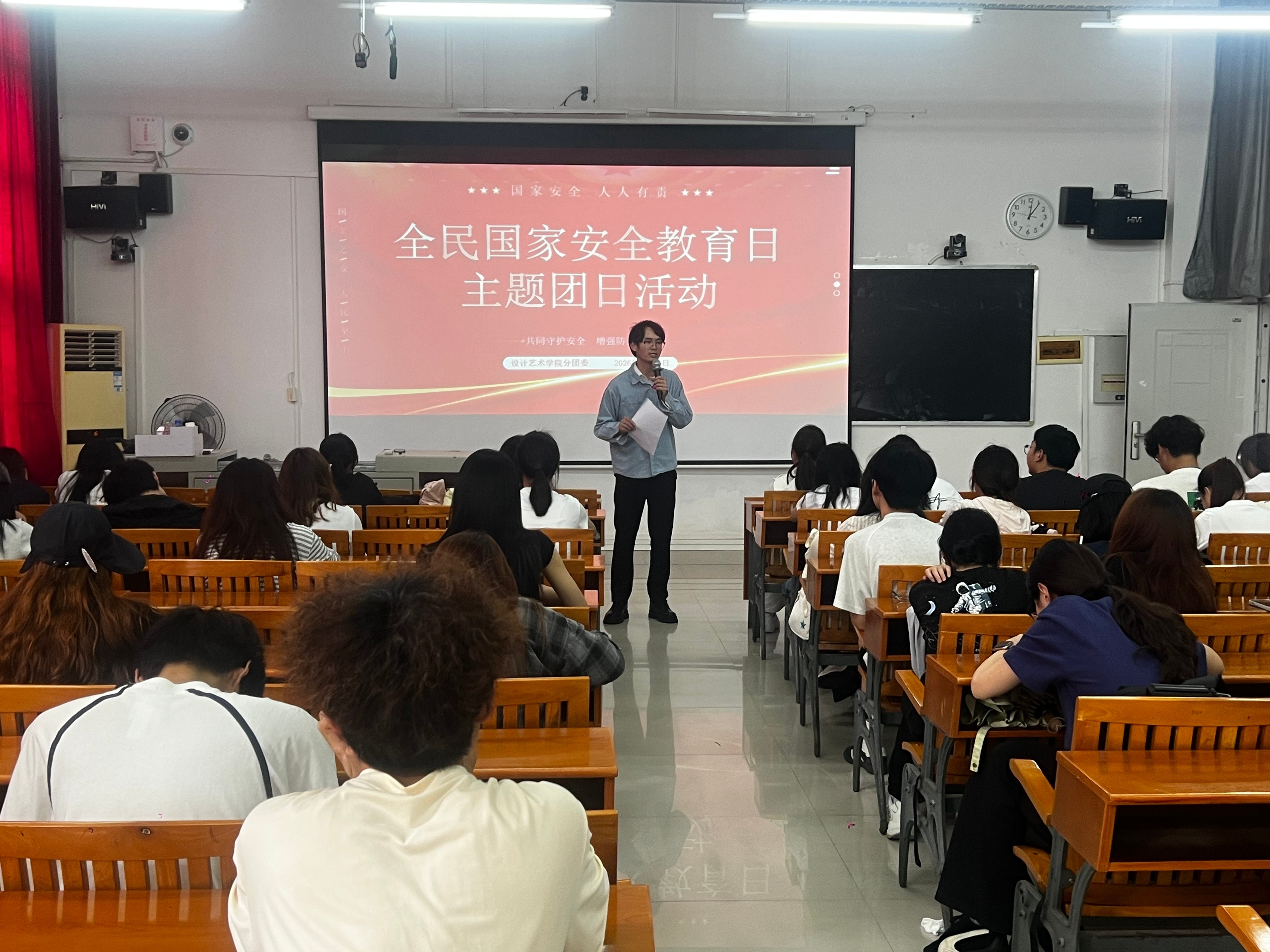 在第11个全民国家安全教育日之际,为深入贯彻习近平总书记关于加强国家安全教育的重要指示精神,切实增强共青团员的国家安全意识,设计艺术学院分团委于校区伦理楼106教室开展国家安全主题团日活动。活动由分团委副书记覃轶科老师主持,各班级团支部书记、组织委员等团干部参加。