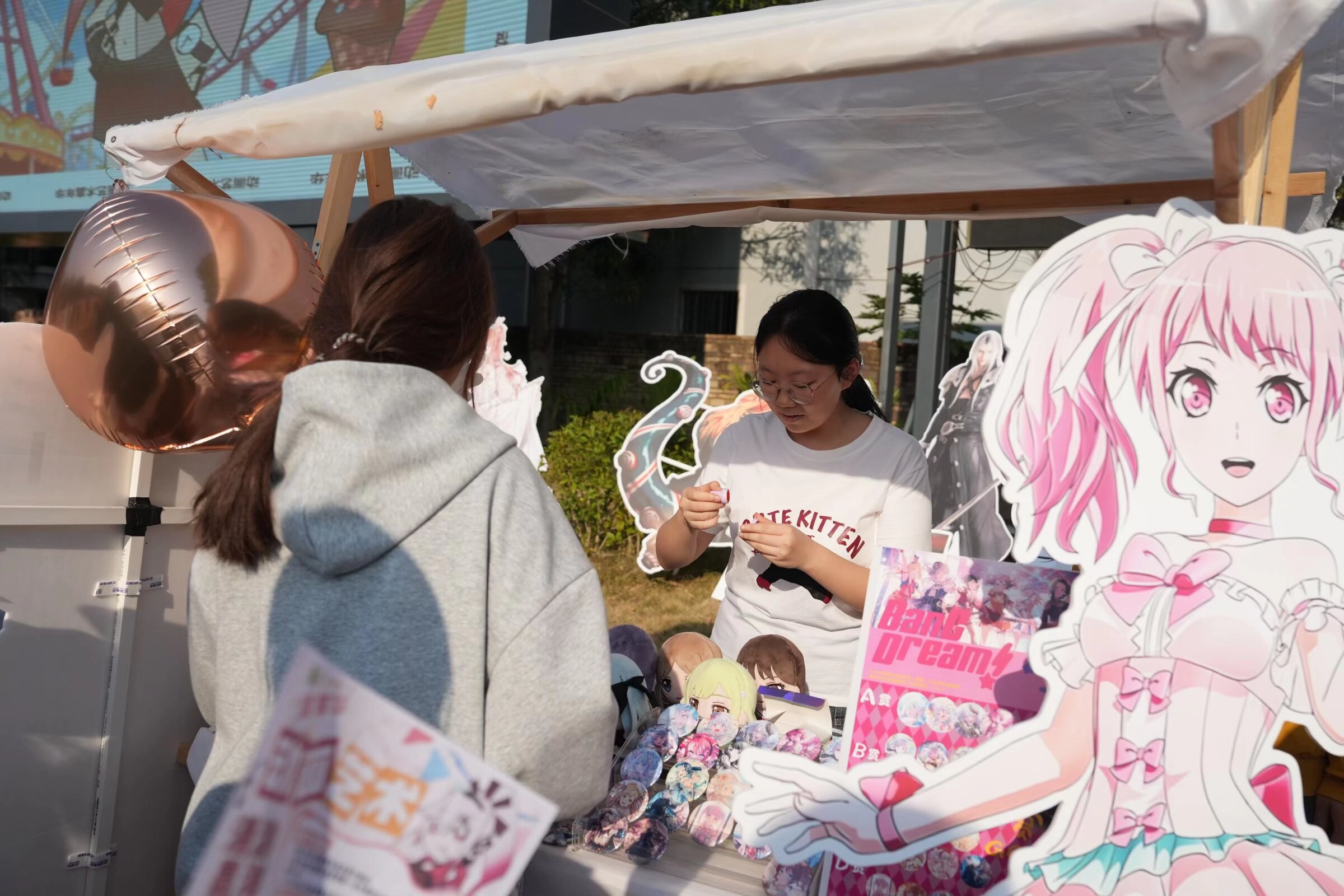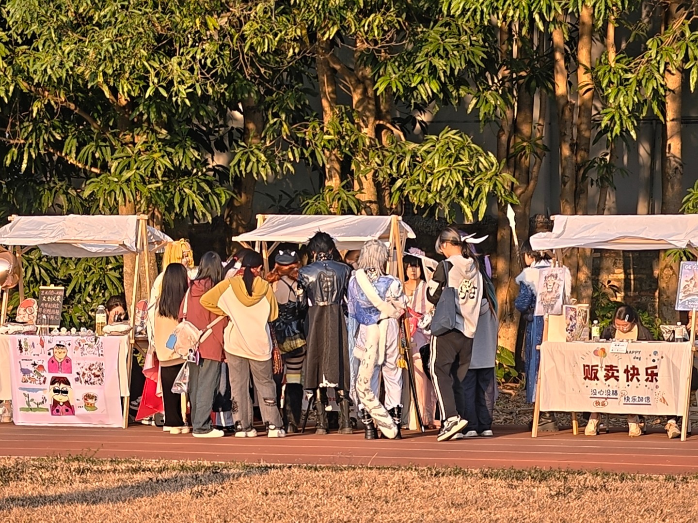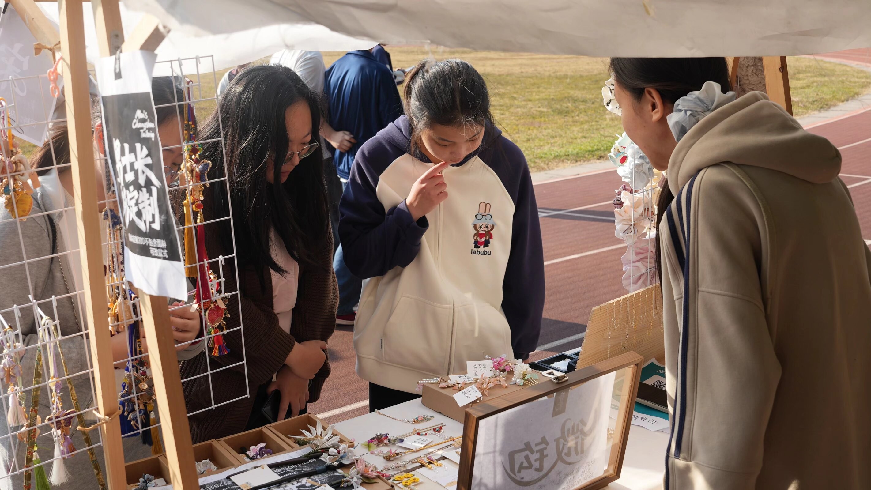 活动现场洋溢着热烈欢快的氛围,动画创意集市各摊位前人头攒动、热闹非凡。学生原创IP衍生文创、手作、个性周边等产品琳琅满目,设计新颖且充满巧思,既有贴合青春主题的潮流设计,也有融入传统元素的创意表达,引得同学们纷纷驻足挑选。