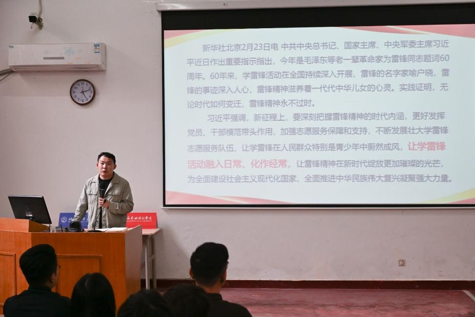 3月初,学院党总支牵头,联合分团委、学工办举行学雷锋活动启动仪式暨志愿服务月动员大会。党总支副书记巴瑞斌讲授专题党课,解读雷锋精神时代内涵,传达习近平总书记关于深入开展学雷锋活动的重要指示精神,强调雷锋精神永不过时。分团委书记王宇凡部署校园清洁等志愿服务任务,明确分工与标准。党总支书记张帆作总结讲话,鼓励同学们将雷锋精神融入日常、化作经常,在实践中锤炼品格、增长才干。