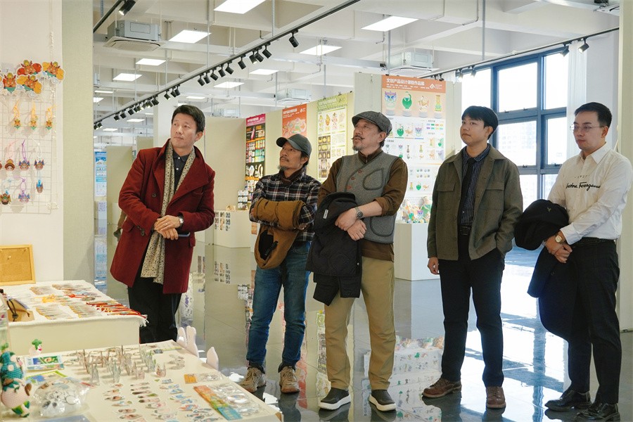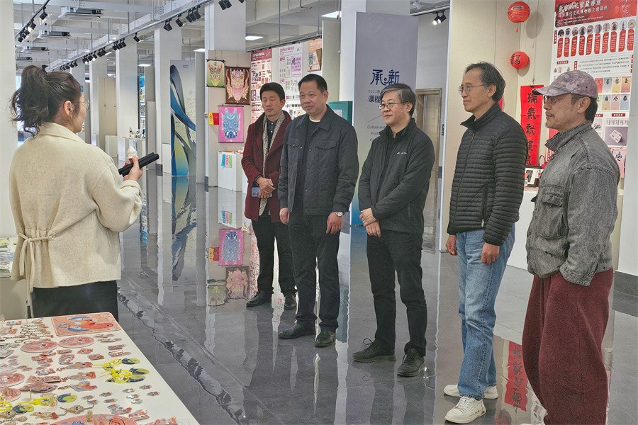 北海艺术设计学院党委书记覃宪儒、校长卢新华陪同清华大学美术学院马赛院长参观学校展览