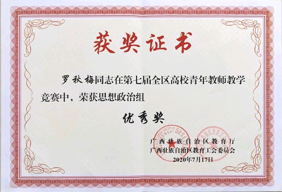 喜报:我院教师罗秋梅荣获第七届全区高校青年教师教学竞赛思想政治组优秀奖