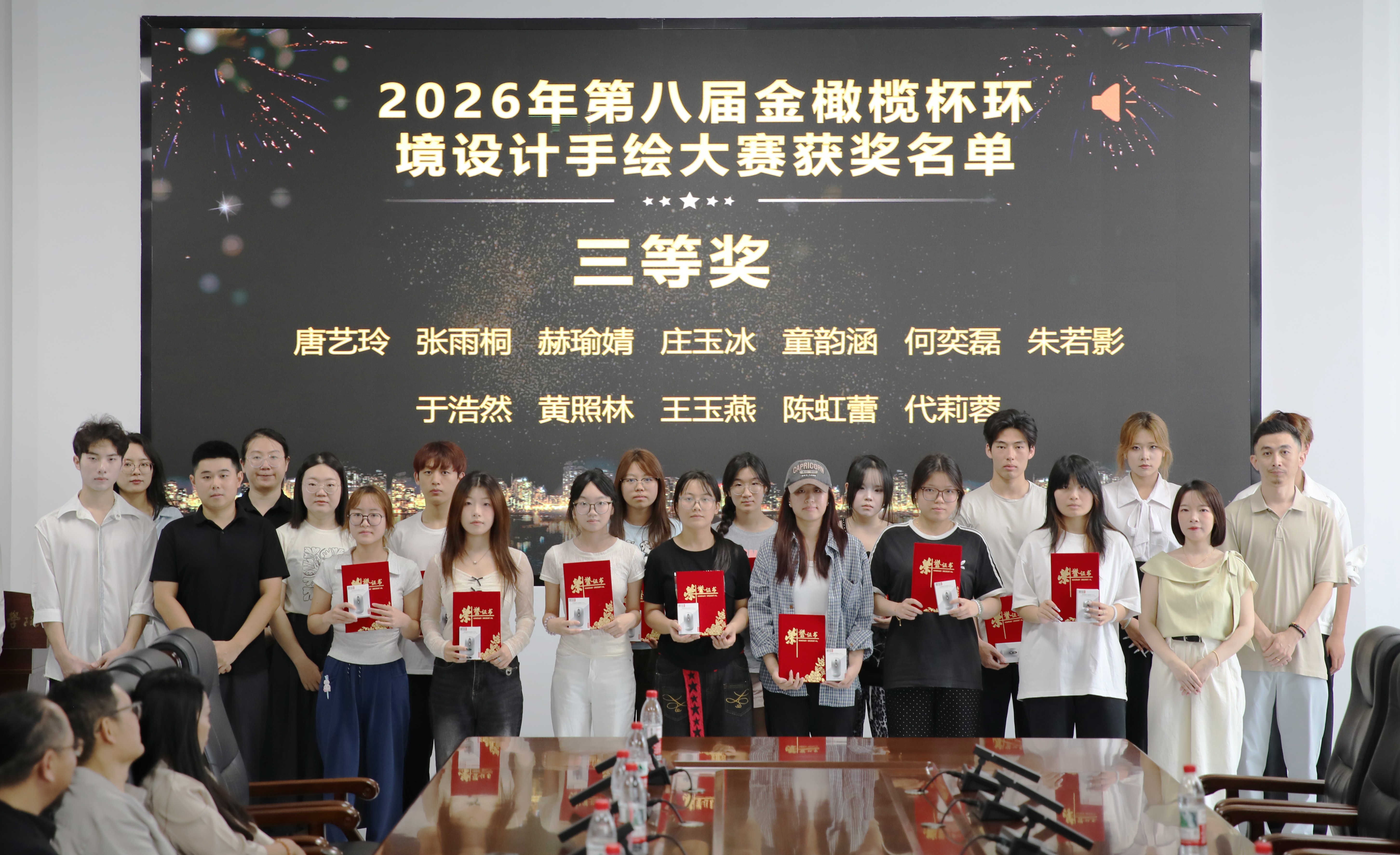 本次“金橄榄杯”手绘设计大赛,为环境设计专业学子搭建了展示才华、交流学习的优质平台,有效推动了《手绘表现技法》课程思政建设与实践教学的深度融合,充分彰显了我校以赛促学、以赛促教的育人成效。颁奖典礼在全体领导、老师与获奖同学的合影留念中圆满落幕。(王荣禄、陈昊/摄)