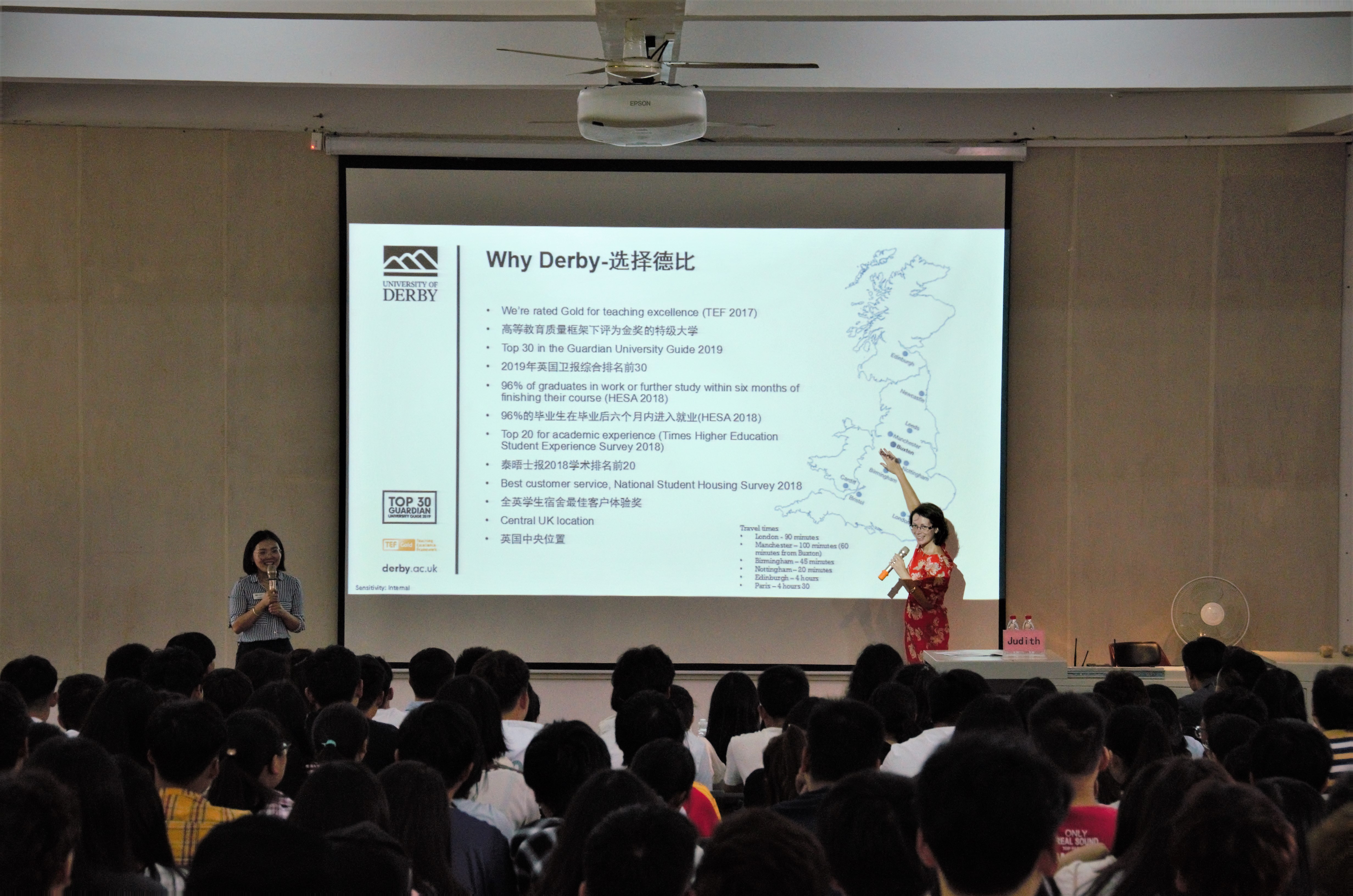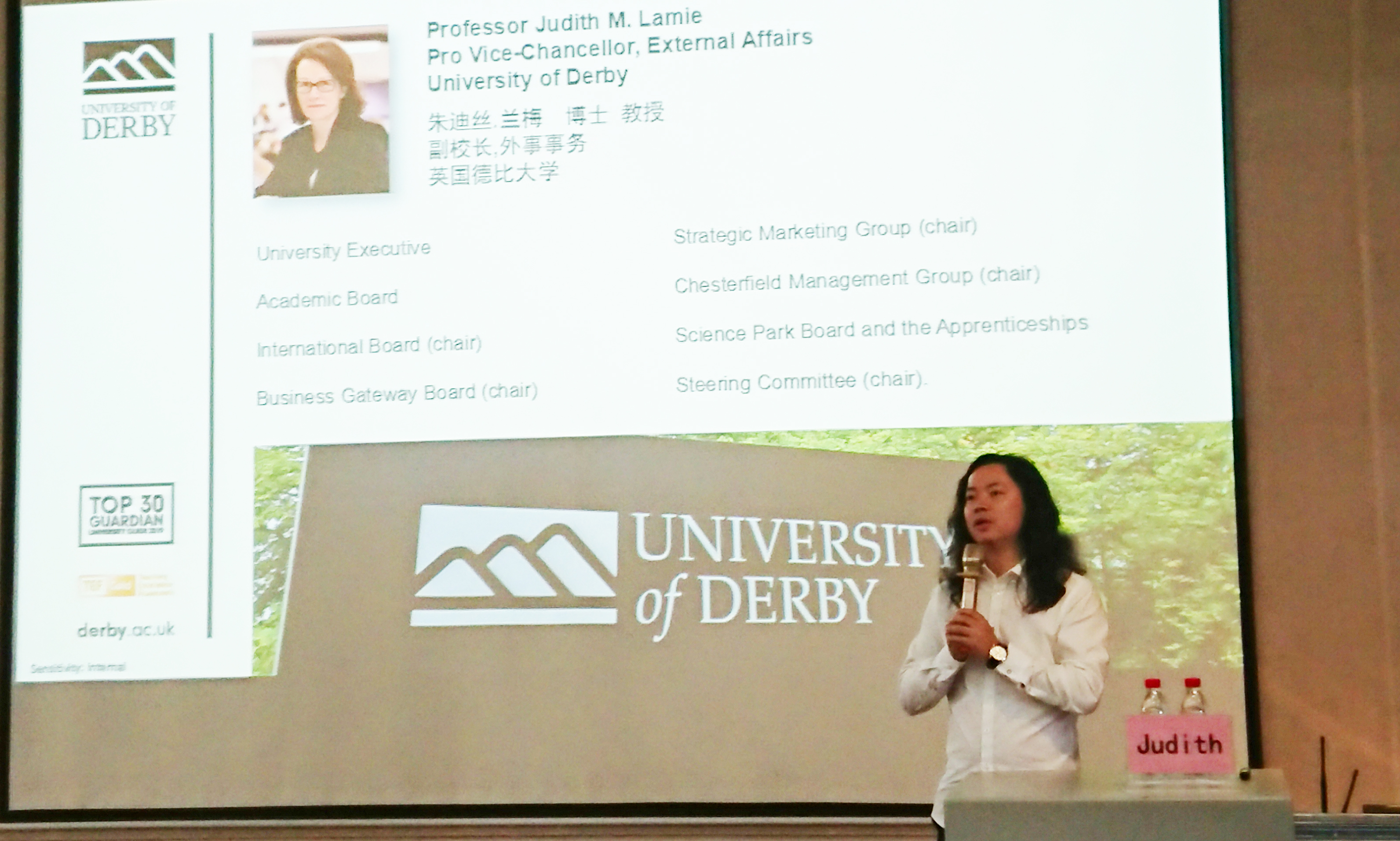 伴随着热烈的掌声,Judith常务副校长向大家带来诚挚的问候。她首先介绍了德比大学位于文化历史遗产丰富的德比郡,周边有国家公园和游乐场等设施。而后依次介绍了教育学院、商学院、自然科学学院、工程学院等,各个学院都获得过良好的成绩。学校开展校企合作使其就业率达到96%,给学生更好的提供了实习机会发展空间,让学生寻找更广阔的舞台。