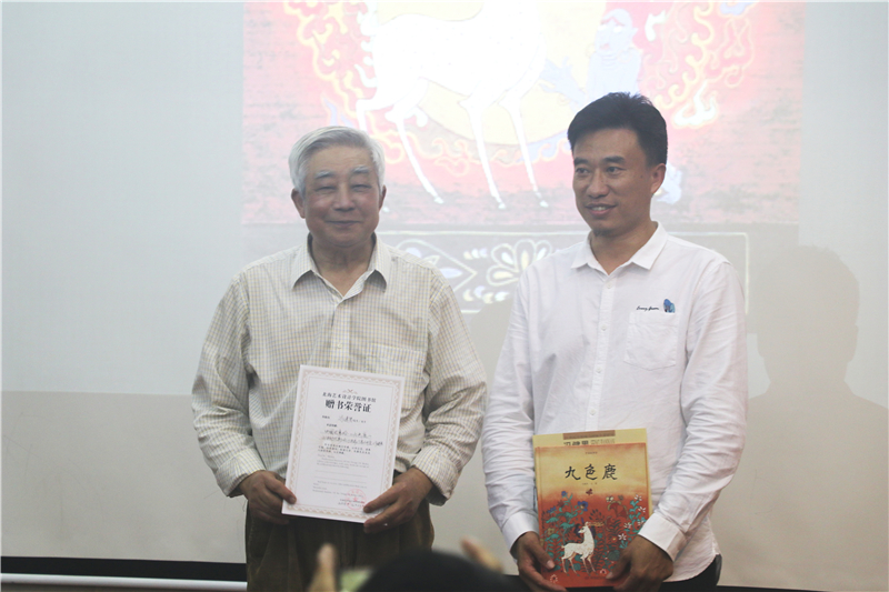 讲座正式开始前,动画学院常务副院长陶立阳代表我校为冯健男教授颁发聘书,正式聘请冯健男教授为我校客座教授,同时冯健男教授向我校赠送《九色鹿》画册