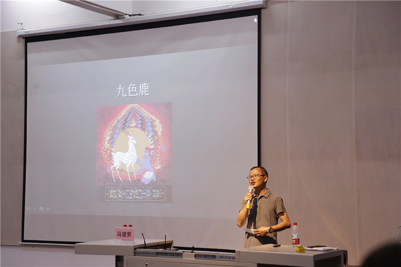讲座过程中,冯健男教授《九色鹿》的创作过程谈到,敦煌莫高窟是神圣的,是中国绘画宝库,因此下定决心做好《九色鹿》的场景设计,展现敦煌所带来的魅力。创作中我们坚持尊重敦煌原始风味,并适当加入了其他朝代的壁画,进一步形成九色鹿的风格。