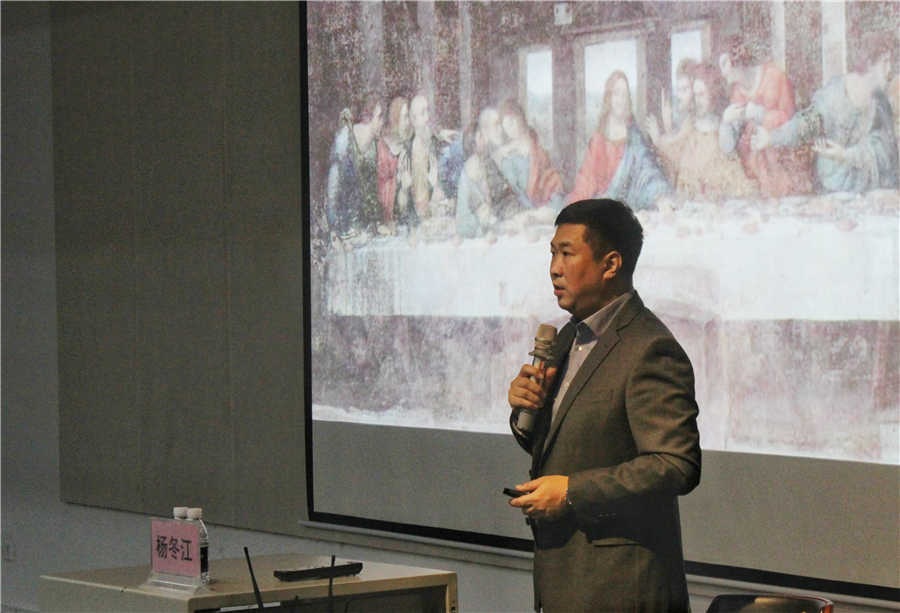 讲座开始,杨教授表示装饰与设计始终是生活中必不可少的一部分,当今中国乃至世界的设计更新换代十分迅速,在这个大趋势下,设计的本质却是不变的。杨教授说学会观察是把握设计实质的最好方法,以中西方绘画作品为例,西方画家擅长使用透视画法,而中方画家则使用全观视角来呈现画面布局。正是由于各国画师观察方式、认识方式的不同,促进艺术设计作品的多元化和欣欣向荣。因此,杨教授告诉同学们要多观察设计,并在观察的基础上描绘和表现艺术。