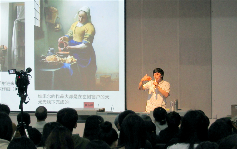 张教授以牛顿发现七色光开启了光的新纪元为切入口,引出第一个主题:感知色彩离不开光的照耀。光、眼、物三者之间的关系构成了色彩研究和色彩学的基本内容,也是色彩实践的理论基础。他建议同学们在考虑色彩搭配与运用场合时,要注意光源的影响。只有专心地读色、阅色、研色,心中才会有悦色。