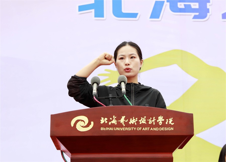 运动员代表人文教育学院艺术教育专业2001班雷佳抒,裁判员代表通识教育学院老师王婷婷,在国旗下进行庄严宣誓,谨记学校规章制度,认真对待每一场比赛,发扬奥林匹克体育精神,友谊第一,比赛第二,全力助推校运会顺利开展。