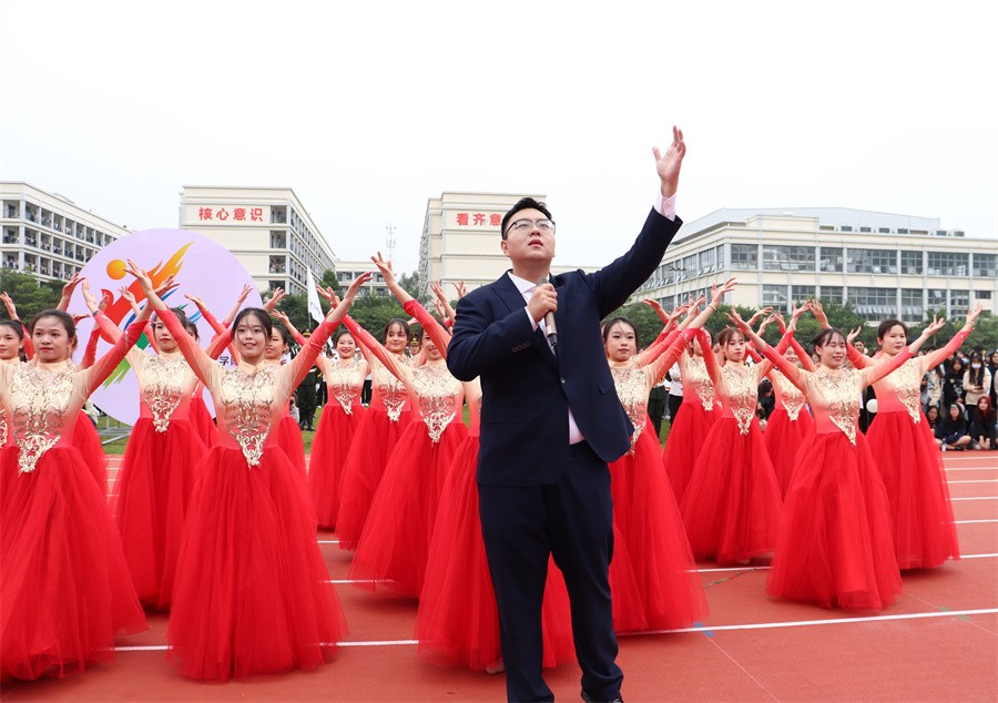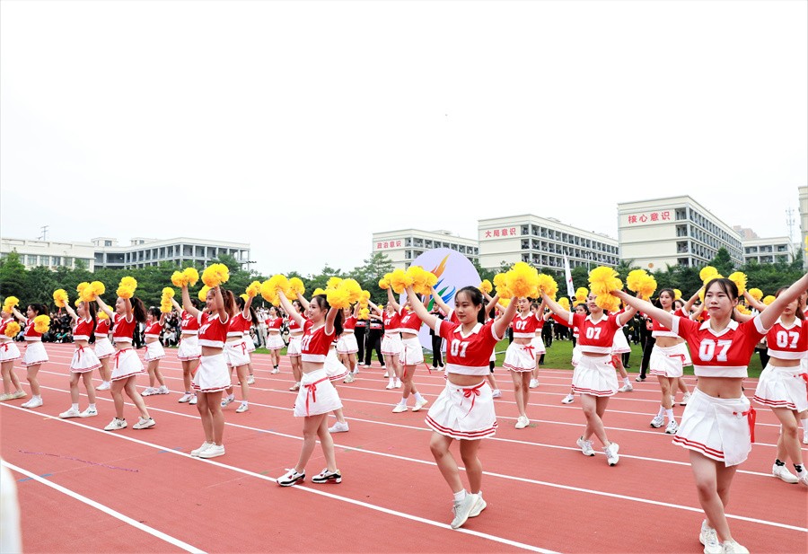 精彩绝伦的表演节目,为开幕式增添光彩,引爆气氛高潮。2022年十佳歌手带来歌曲《闪亮启航》,悠扬歌声、欢快旋律交相辉映。由获得2022年全国啦啦操锦标赛(普通高校组)第一名的同学带领表演的啦啦操,大大鼓舞了士气。人文教育学院舞蹈专业表演的拉丁舞,自信优雅的姿态展示无限魅力。由刘琛钊老师领衔舞蹈专业伴舞的大型歌伴舞节目《向往》传递磅礴力量。