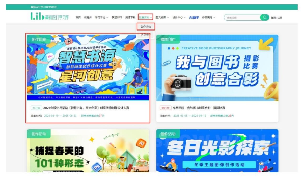 3、通过图书馆官网,找到“翼狐设计学习库”,进入“比赛活动”-“创作活动”找到活动入口即可参与。