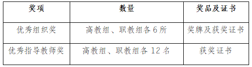 1.优秀组织奖:为激励各高校积极组织学生参与主题知识竞赛活动,主办方将根据各高校的参赛人数、成绩与活动组织情况,对高教组、职教组分别进行排名,评选优秀组织奖12所(高教组、职教组各6所)。