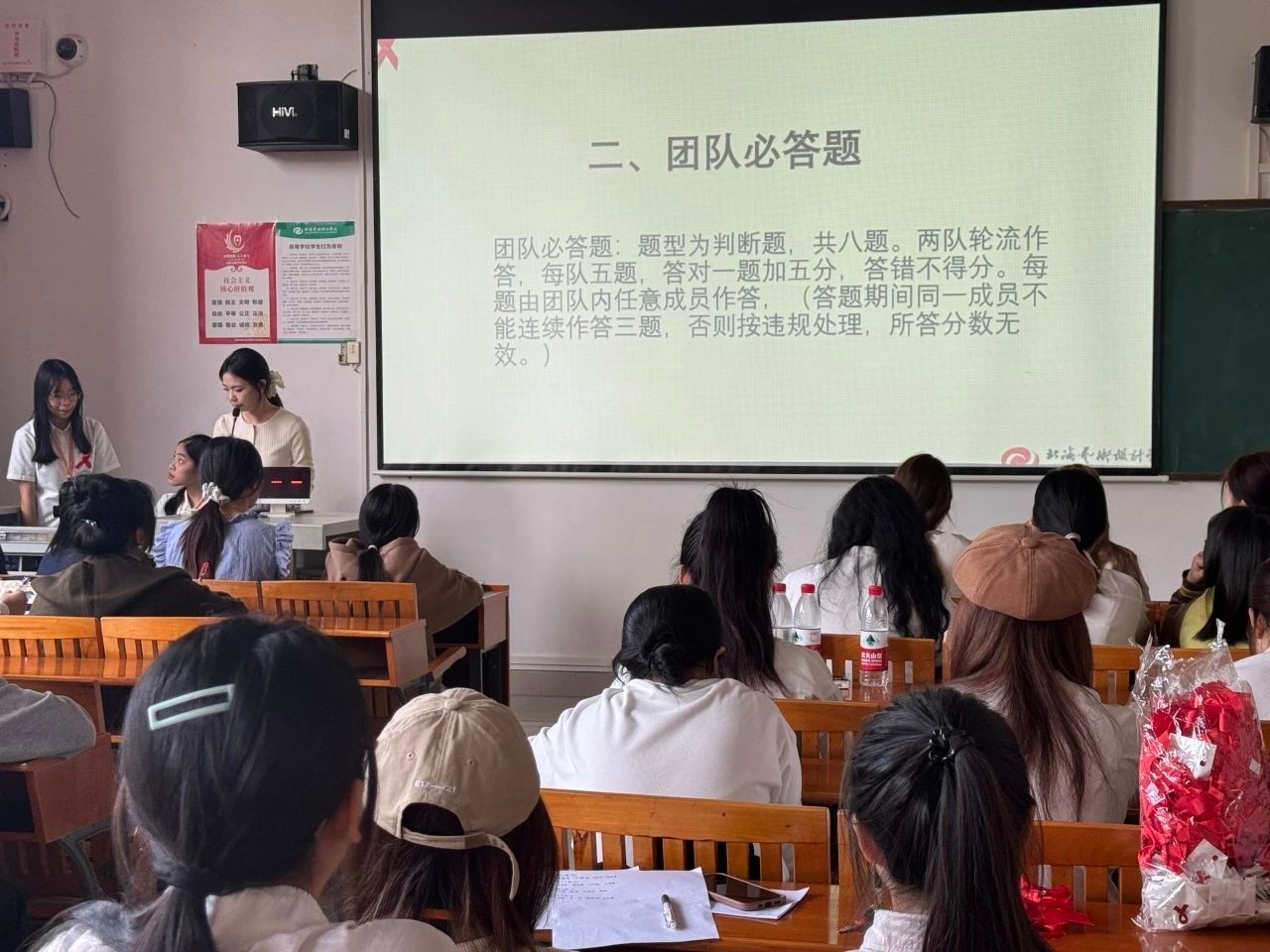 在竞赛开始之前,工作人员带领参赛选手有序地进行签到,并为他们分发红丝带。他们胸前的红丝带是防艾的标志,待参赛选手落座后,防艾知识竞赛正式揭开了帷幕。