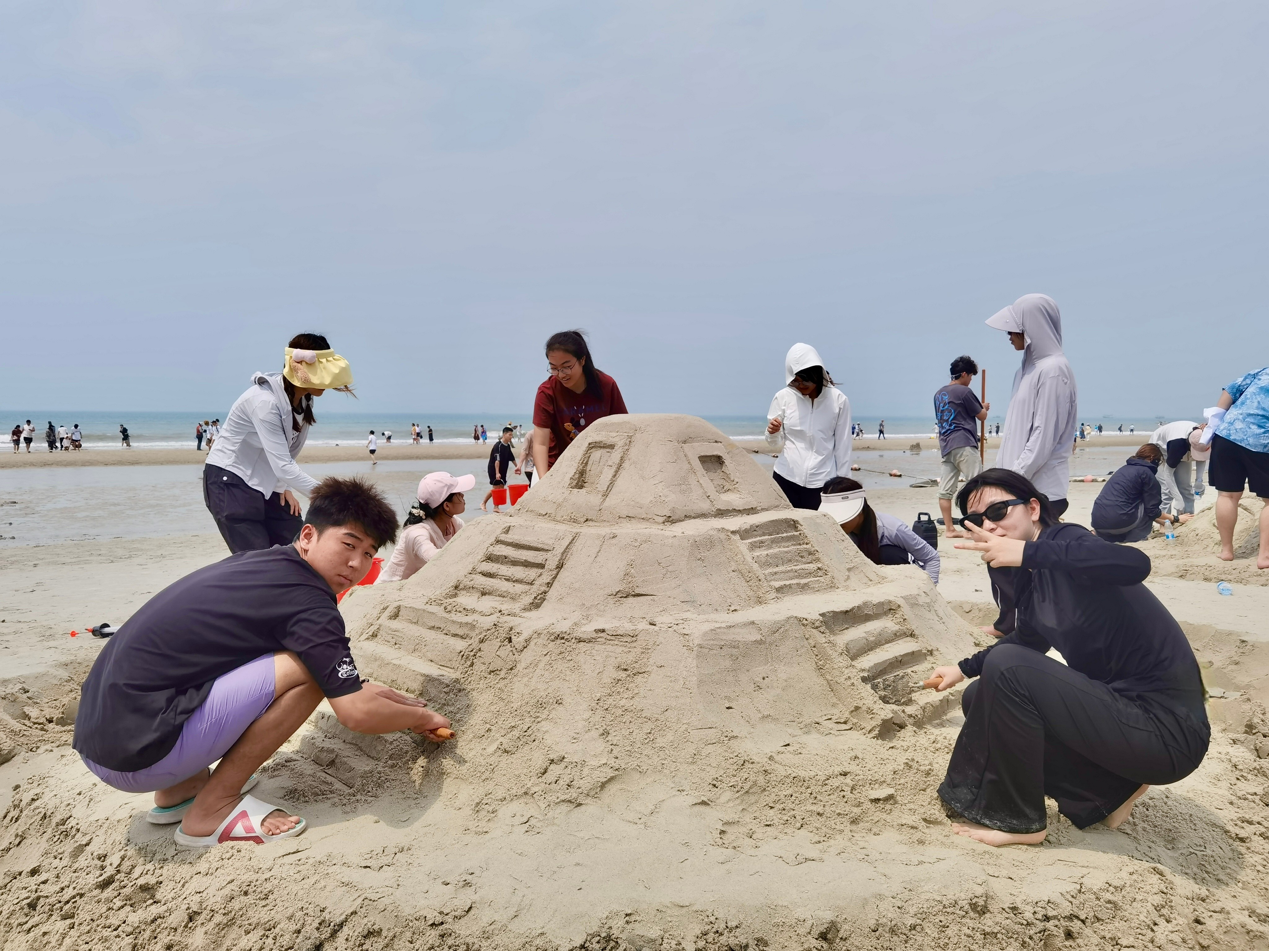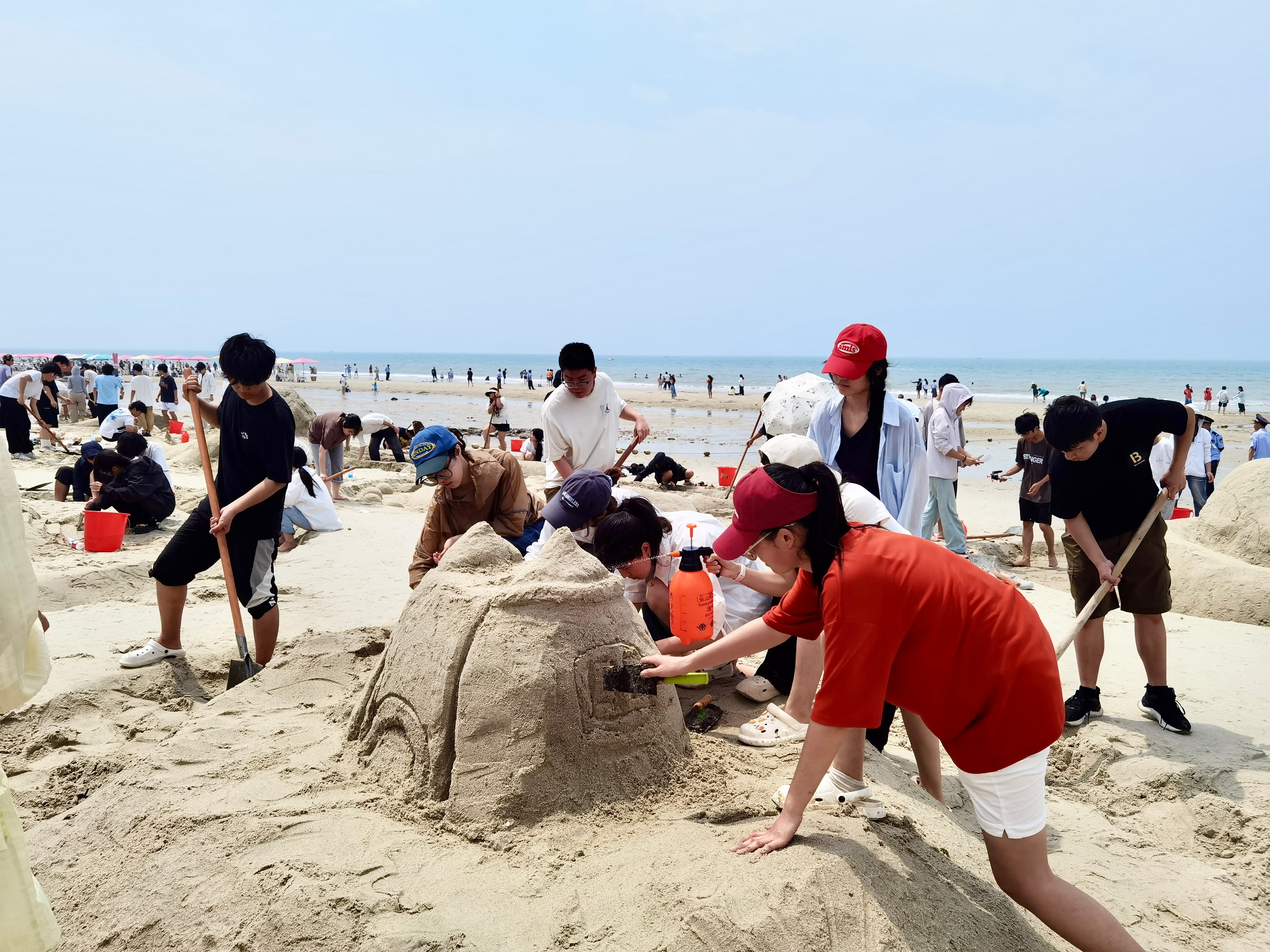 此次运动会共设沙滩排球、同舟共济、巨人脚步、水到渠成、袋鼠跳等五个竞赛项目,这些特色比赛项目以集体形式竞赛,强调团队协作和相互帮助。比赛现场,海浪声伴着热烈的加油声和欢笑声,同学们在集体运动中感受团队精神,增进友谊,收获快乐。沙雕比赛中,同学们尽情发挥创造力,大胆创新,以铁锹为刻刀,将纸上的设计图稿用细软白沙慢慢堆砌雕琢成型,一座座雕塑既有写实的雕刻,又有活泼的创意,同学们用生动的沙雕作品展现着他们对美的追求。
