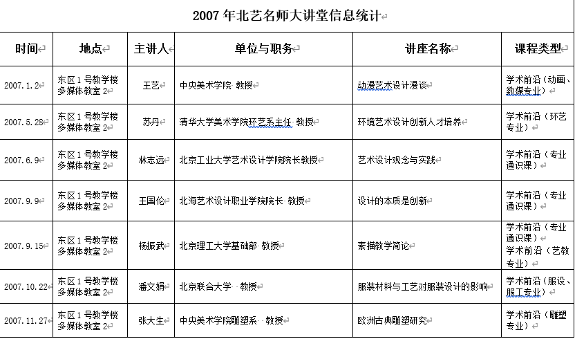 2007年北艺名师大讲堂信息统计