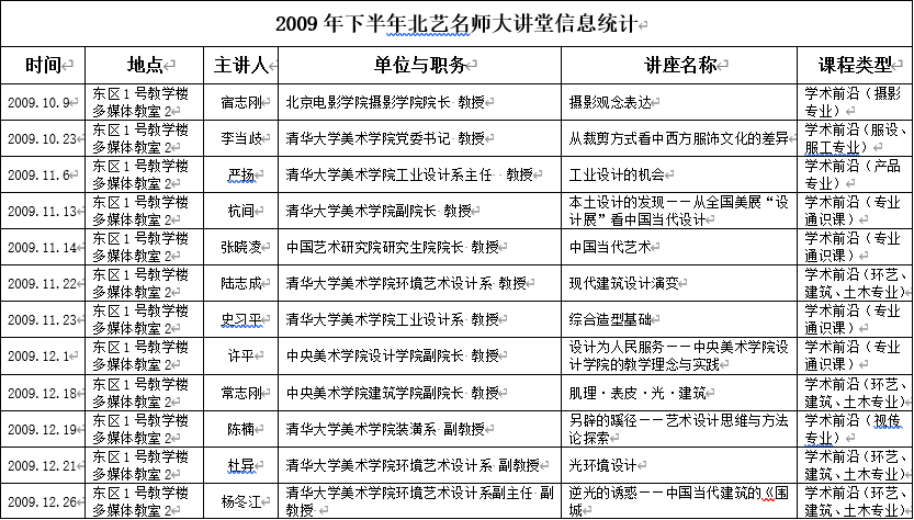 2009年下半年北艺名师大讲堂信息统计