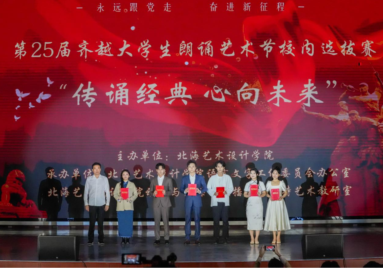 近日,“传诵经典 心向未来” 第二十五届齐越朗诵艺术节北海艺术设计学院选拔赛在西校区大礼堂圆满落幕。本次比赛由北海艺术设计学院主办,学校语言文字工作委员会办公室和动画与传媒学院播音与主持艺术教研室共同承办,学校副校长陶立阳、包建明,教务处处长武鹏程,动画与传媒学院党总支书记张帆,院长孙永辉,党总支副书记黄强红等学院领导出席本次大赛。