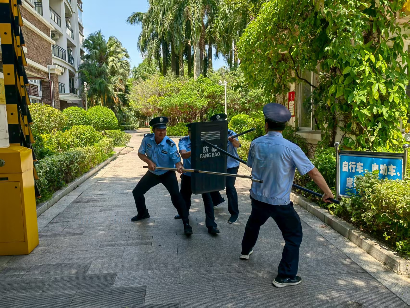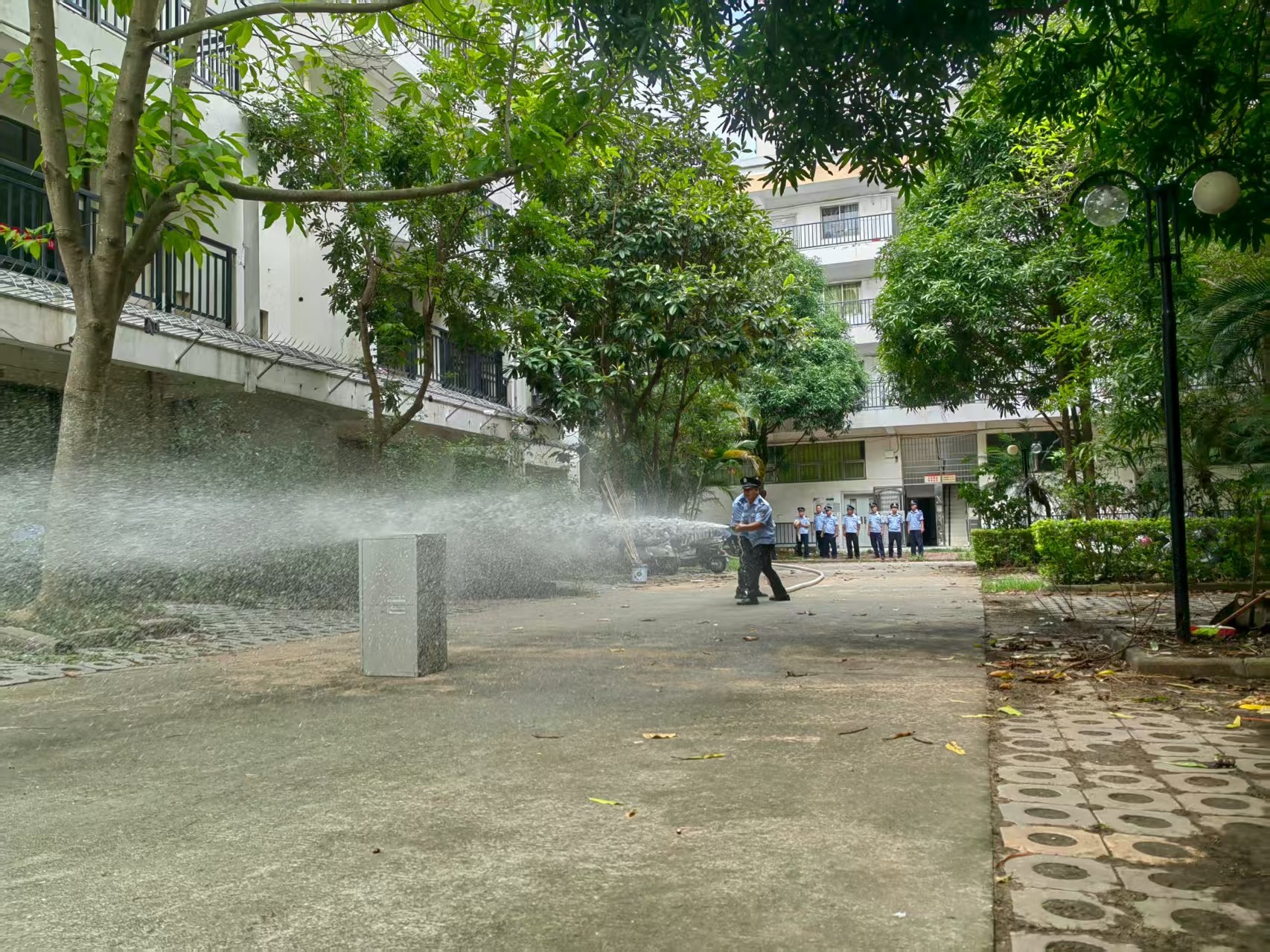 本次培训立足当前校园安全面临的新形势、新挑战,以提升实战能力为目标,既有理论学习讲解,又有实战实操演练。理论学习主要是规章制度、安保人员岗位职责等;主要进行了日常养成的实操实演,防暴器械使用、防暴队形排列、暴徒控制应急演练和灭火器、消火栓使用及初期火灾灭火演练。