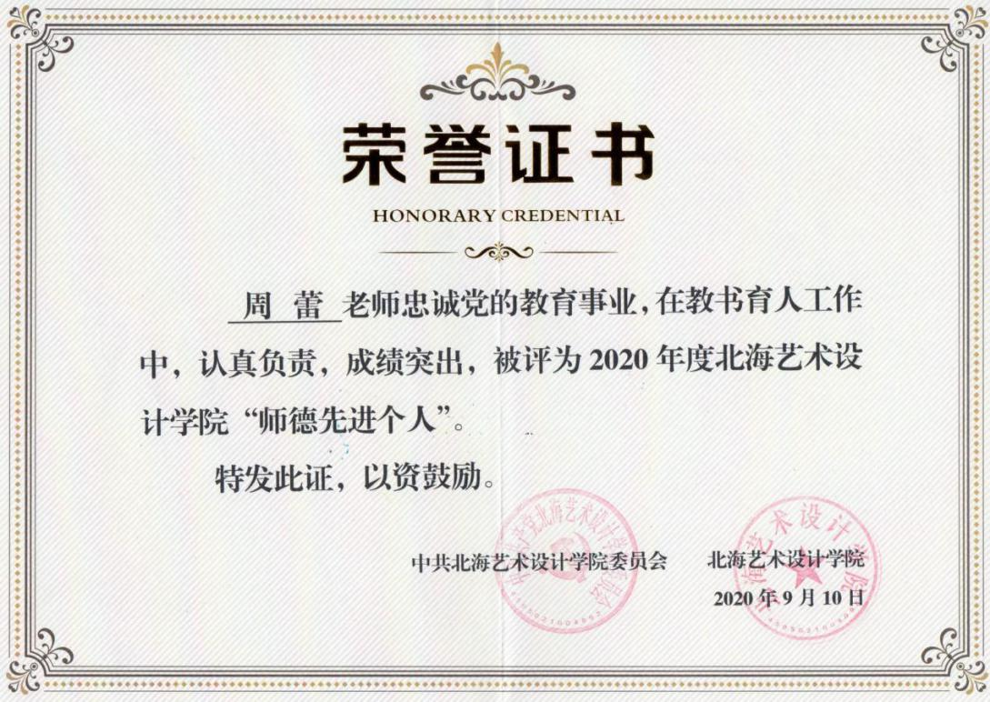 周蕾老师不仅有丰富的教学实践和研究经历,还擅于辅导和帮助学生参加各级各类赛事。仅近几年组织、指导学生参加的赛事就有15项,如:2020年8月,指导学生姚远参加第六届中国国际“互联网+”大学生创新创业大赛项目,荣获国家级铜奖;2020年10月,指导学生张志桓参加“第三届广西中华职业教育创新创业大赛暨第四届中华职业教育创新创业大赛,荣获广西区金奖;2019年,指导学生唐庆参加“全区高校第三届大学生创客马拉松”荣获自治区一等奖;2021年,辅导学生马丰杰创作的作品《石雕归墟》荣获广西壮族自治区委员会统一战线工作部主办第三届中华职业教育社非遗创新大赛广西赛区本科组第三名,并获国赛推荐资格。其次,辅导各级各类自治区级赛事银奖2项、铜奖13项。由于周蕾老师的辛苦付出、培育,让她收获了多项个人奖项和荣誉,如2021年,参加广西壮族自治区委员会统一战线工作部主办第三届中华职业教育社非遗创新大赛获广西区赛非遗教学成果团队二等奖;荣获自治区“优秀创新创业导师”和“优秀指导老师”、北海艺术设计学院“师德先进个人”、北海市青年创业创新“优秀导师”等荣誉称号。