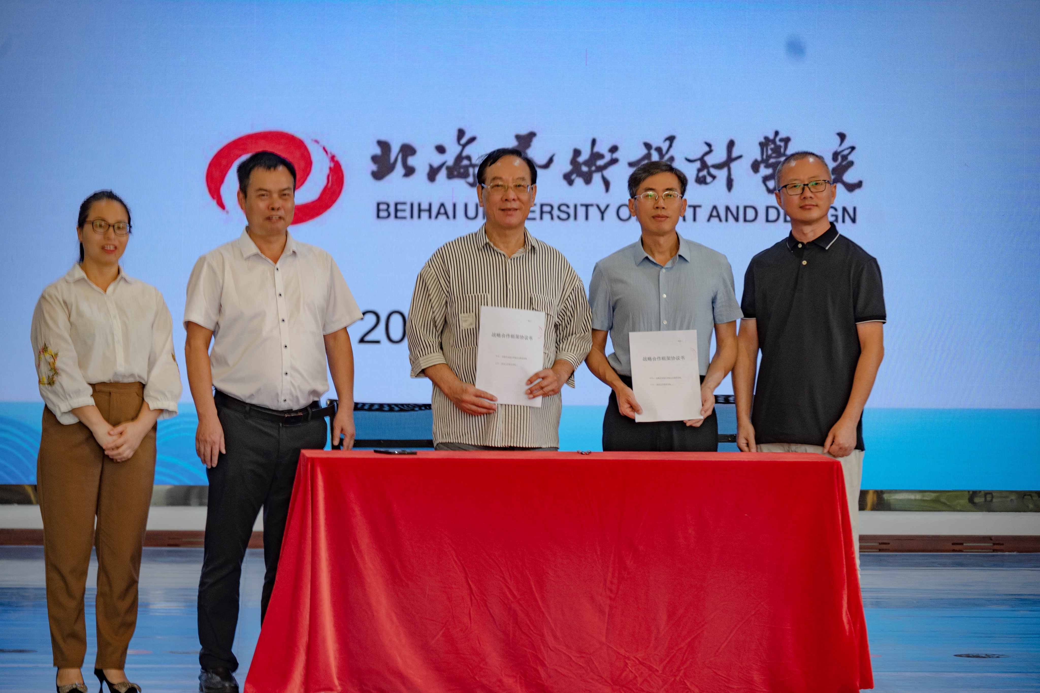 在开幕式最后,我校人文教育学院和贵州大学哲学学院基于共同的价值观和社会历史使命,以及在各自的学科发展中的定位与需求,达成了构建合作伙伴关系意愿。在北海艺术设计学院王斌总督学、贵州大学哲学学院党委周乐成书记、北海艺术设计学院熊秀峰院长的见证下,由北海艺术设计学院人文教育学院名誉院长、哲学专业学科带头人蒙绍荣教授和贵州大学哲学学院梅其君副院长签署了合作框架协议。在未来,两校将在学生培养、课程建设、学科建设、学术研究等方面开展深度的交流与合作。