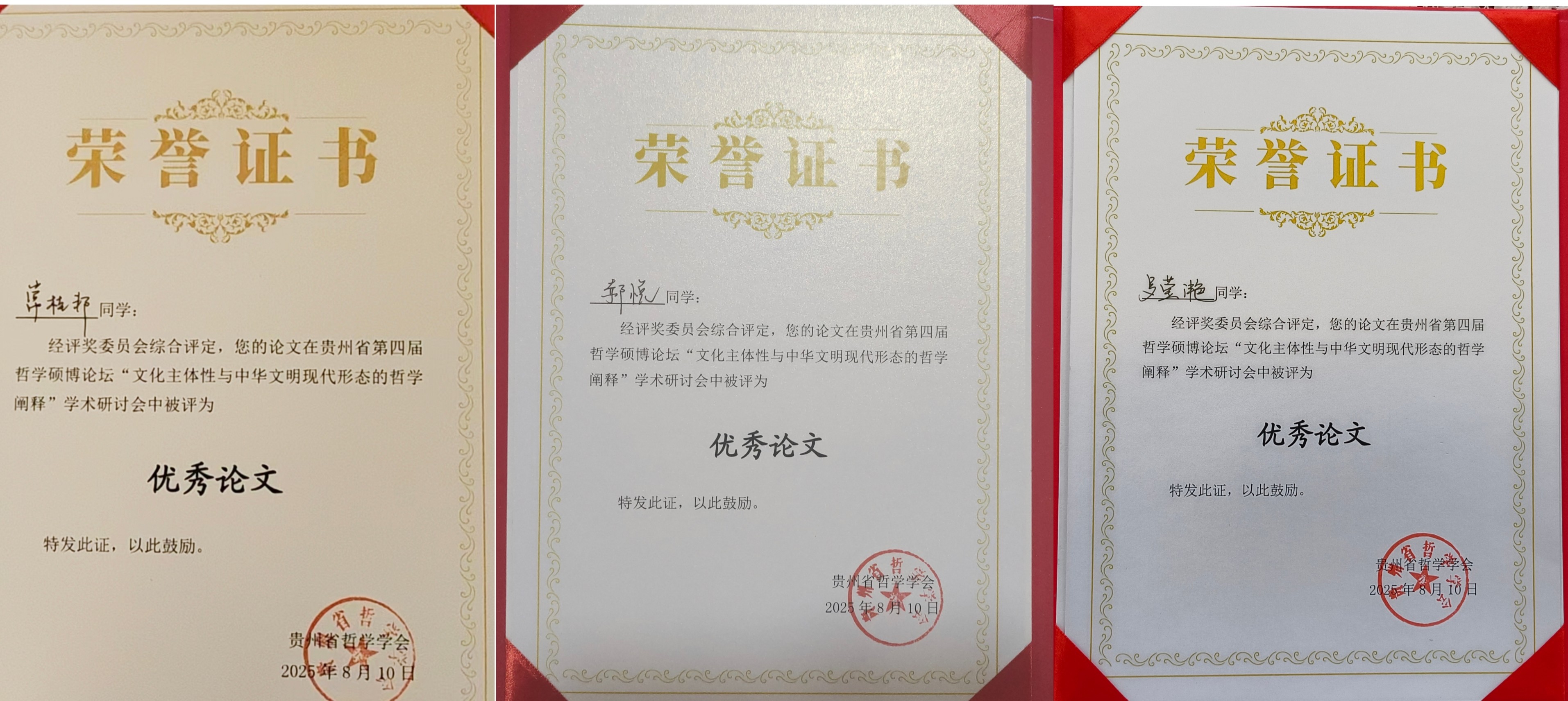 近日,由贵州省哲学学会、贵州大学研究生院、贵州大学人文社科处联合主办,贵州大学哲学学院、中国共产党人“心学”与推进党的建设新的伟大工程高端智库、贵州大学出版社联合承办的“贵州省第四届哲学硕博论坛——‘文化主体性与中华文明现代形态的哲学阐释’学术研讨会”在贵州大学召开。我校哲学学院学生郝悦、常桂邦、黄泽元、罗莹滟参加了此次论坛。参会论文荣获二等奖1项,优秀论文3篇,充分展现了学子学术潜力和学校在人才培养上的育人成果。