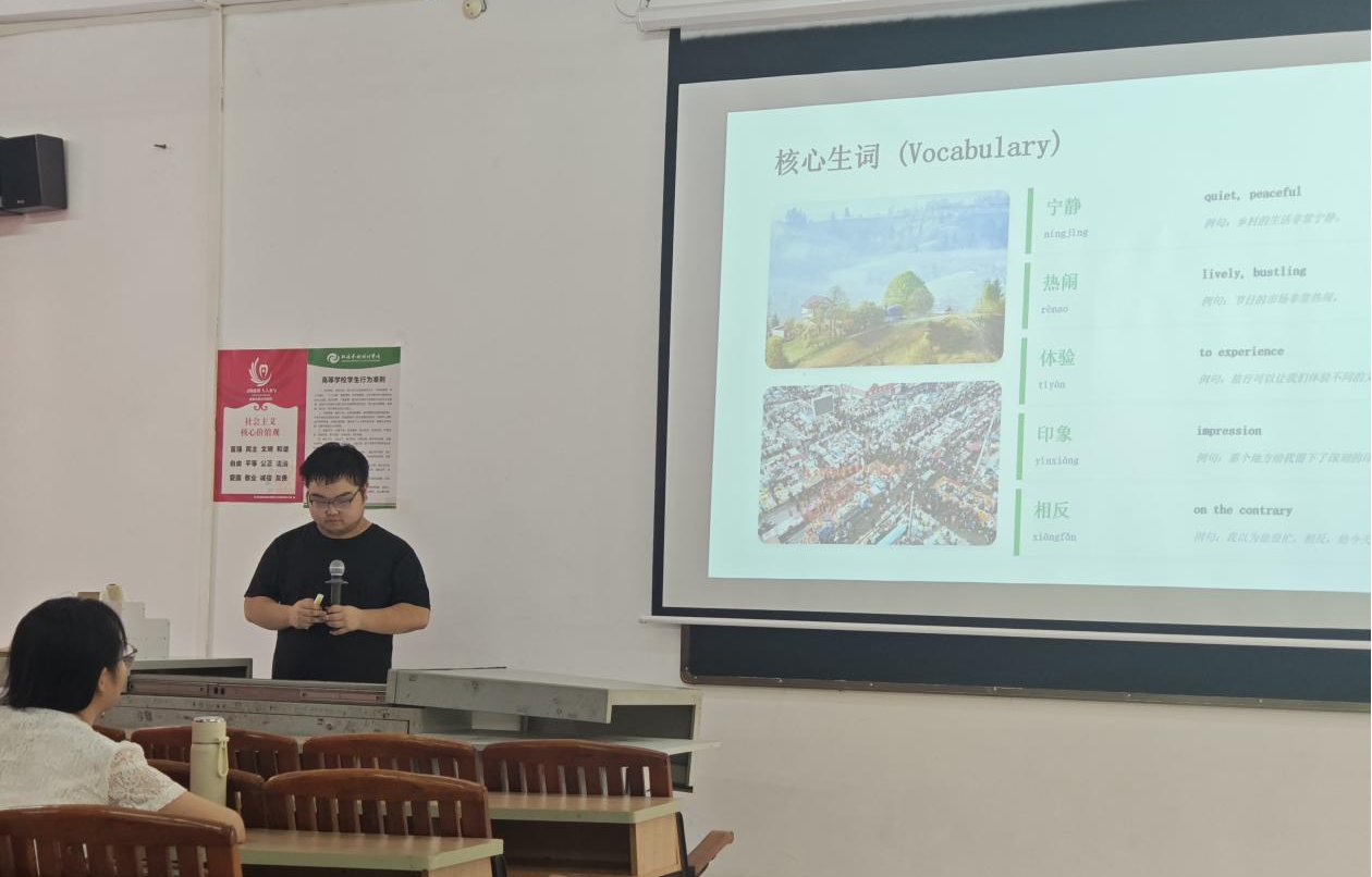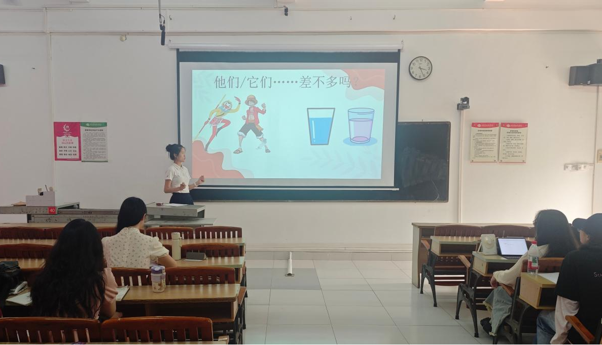 见习活动还包括课堂模拟试讲实操环节。同学们围绕HSK四级教学内容,系统开展备课研讨与现场模拟试讲实训,依托“观摩学习——实践演练——学生互评——教师点评”的闭环式育人模式,将校外教学观摩所学的教学思路、授课技巧与课堂把控方法,灵活融入实操,在实践中锤炼教学技能。指导教师逐一对学员试讲环节、语言逻辑、重难点讲解、课堂互动方式进行细致点评,纠偏优化,全面提升同学们的课堂驾驭、临场应变与教学设计综合水平,切实推动专业理论知识与一线国际中文教学实践的深度融合。