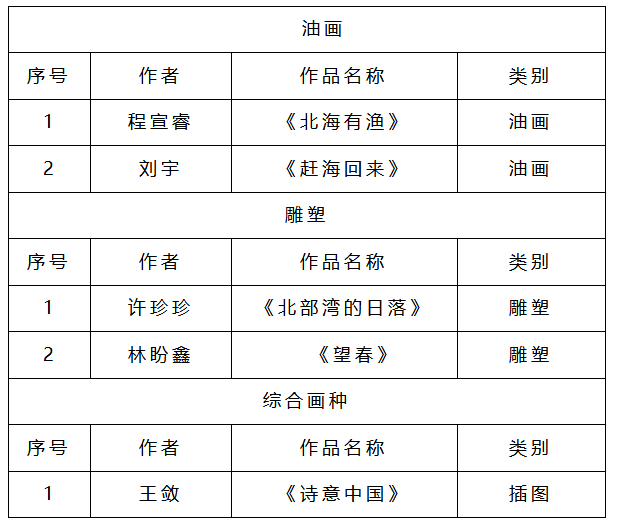 近日,全国第十四届美展复评结果公布,作为五年一次的全国性重要展览,美术学院师生积极参加本次比赛并斩获佳绩。程宣睿、刘宇、许诊诊、林盼鑫、王敛共五名教师作品通过第十四届全国美术作品展览油画、雕塑、综合画种展区复评。