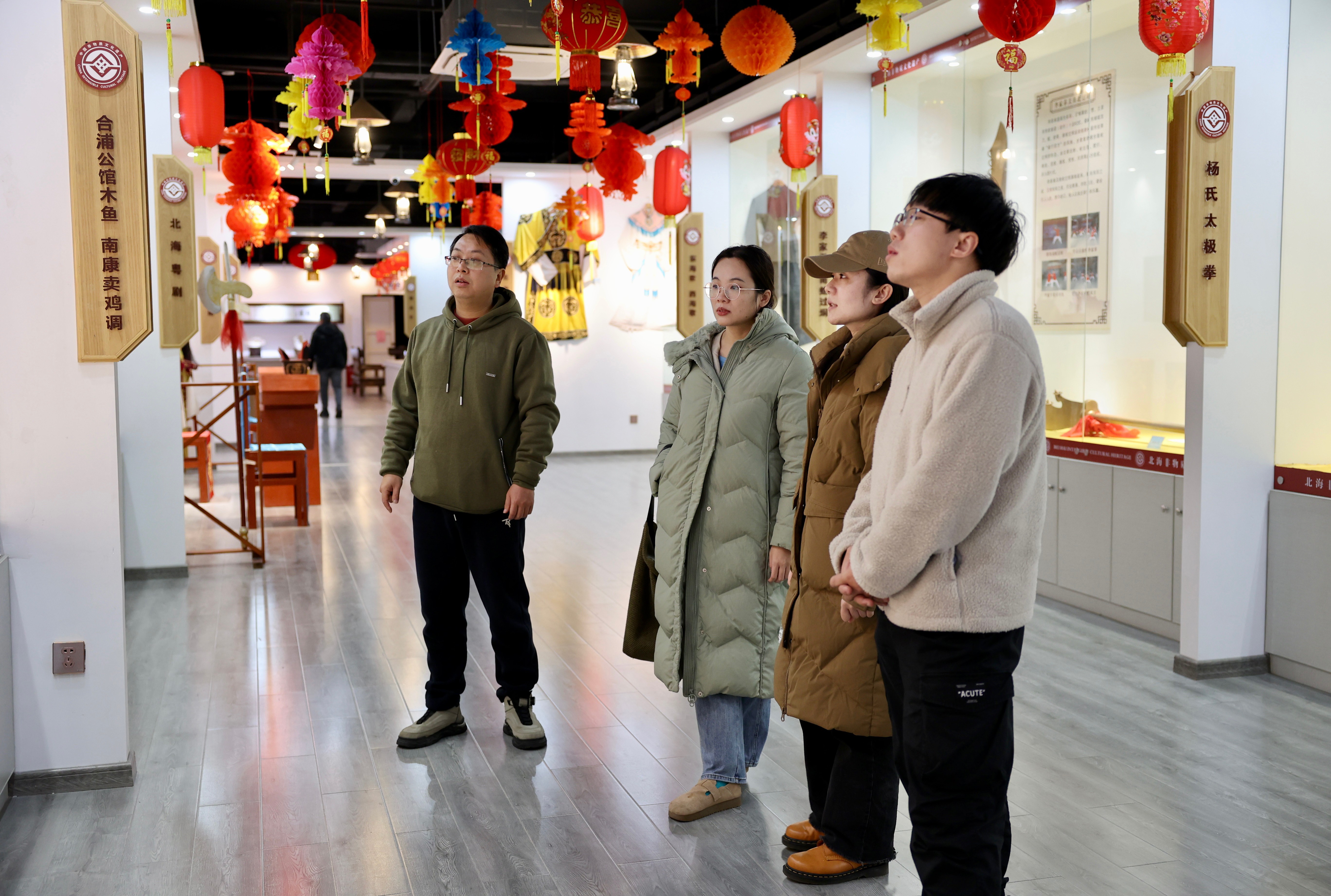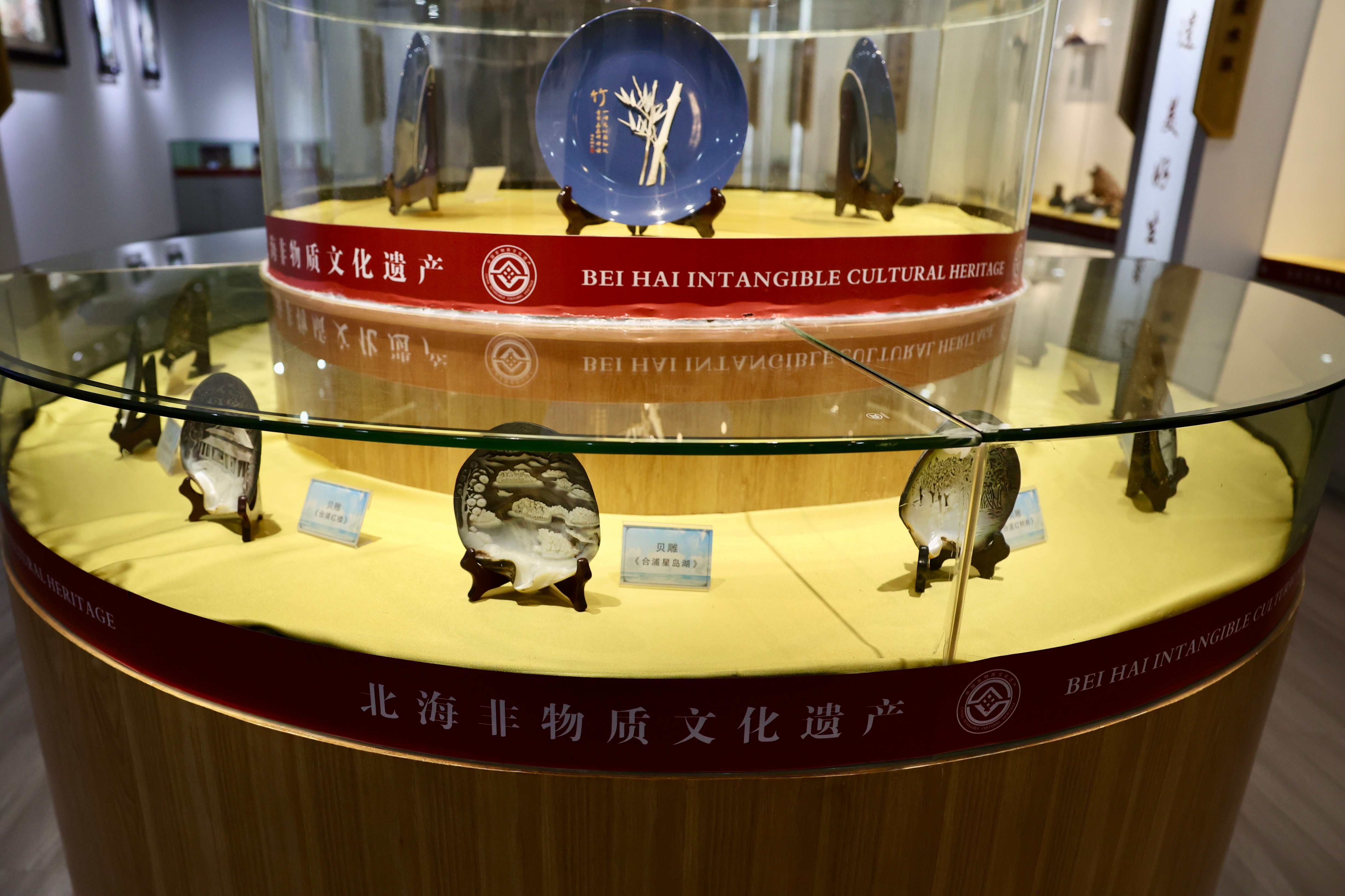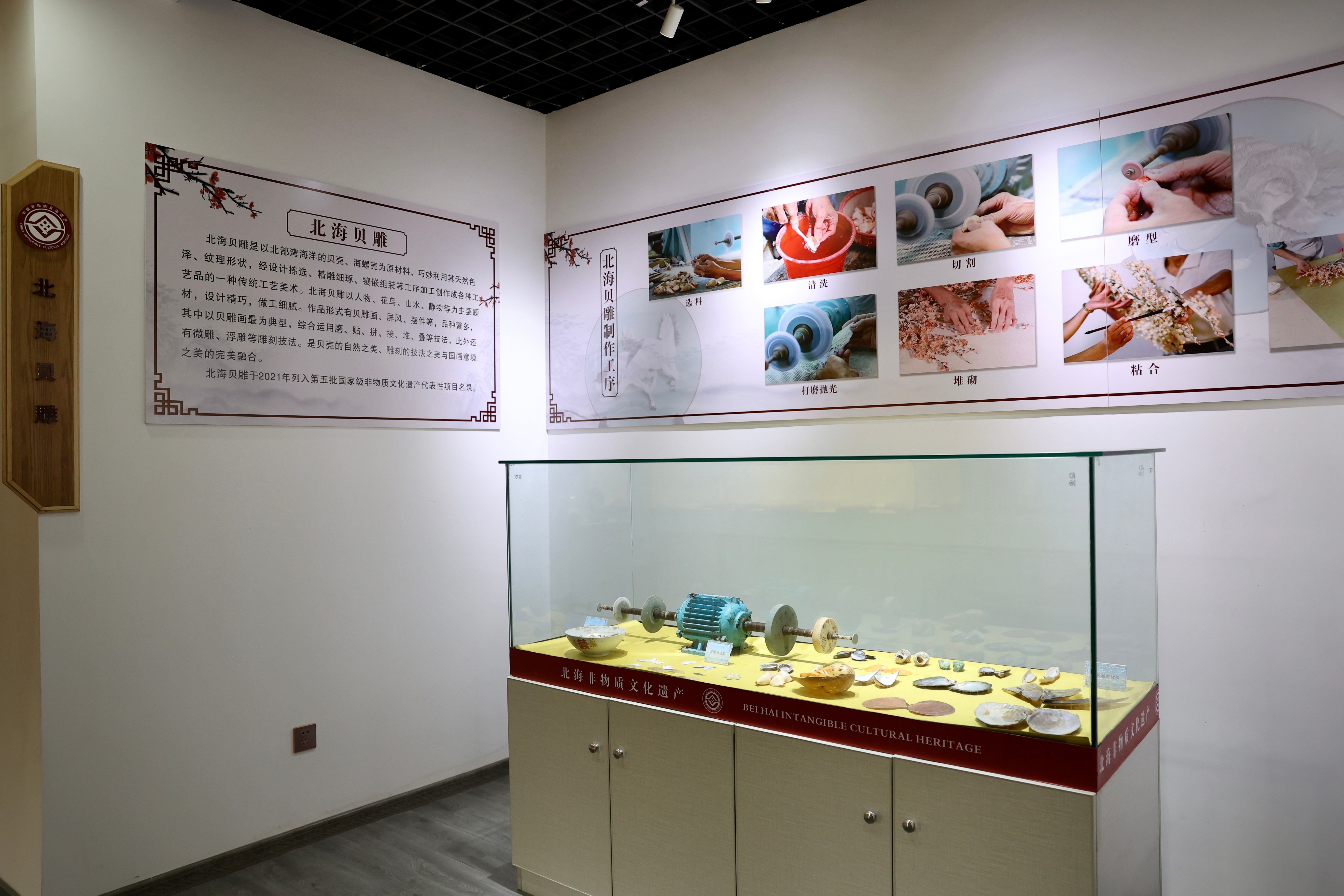 馆内陈列的贝雕、角雕、南珠传统加工技艺、北海粤剧、疍家民俗等非物质文化遗产项目,通过实物展品、图文影像、场景还原等形式生动地展现了北海多元文化的交融与传统。