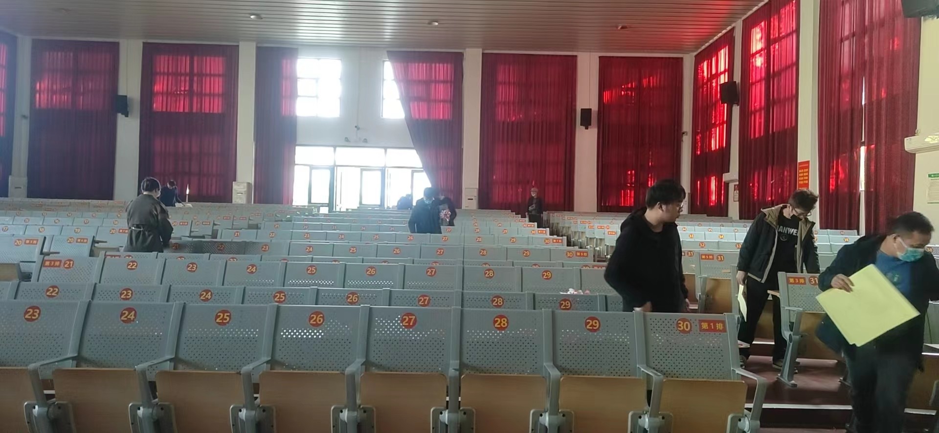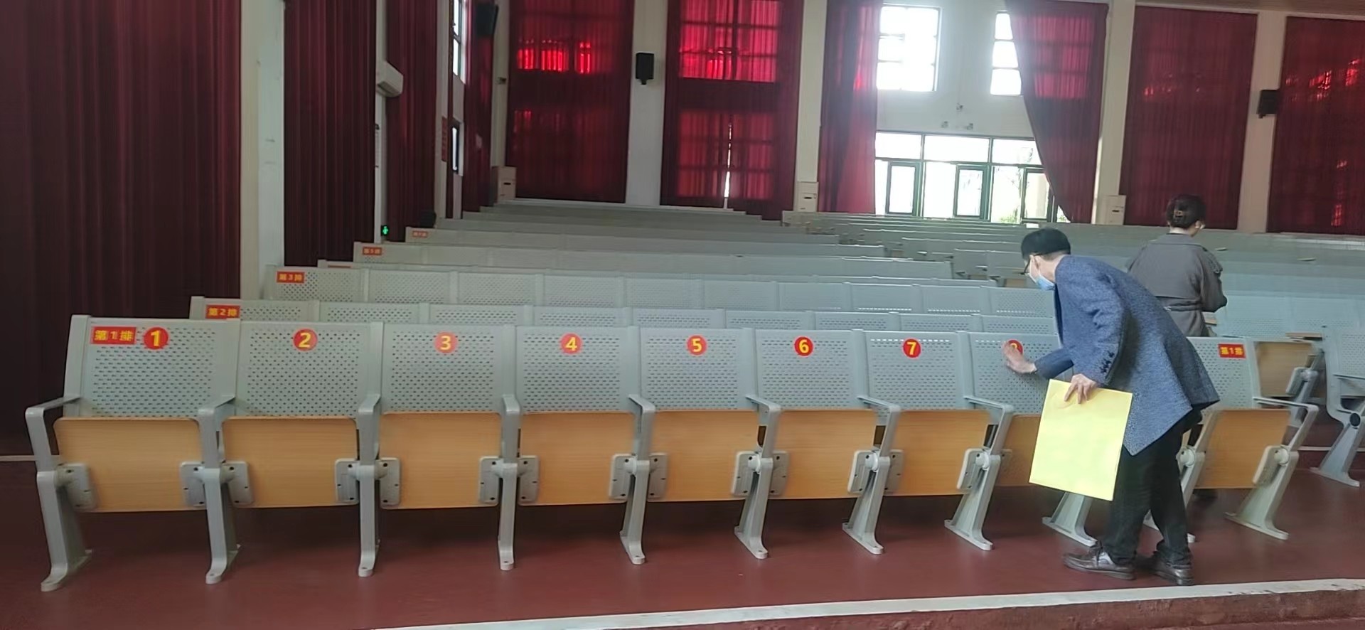 设备与信息处老师给礼堂780个座位换上新标签,新座位更显得有序规范。