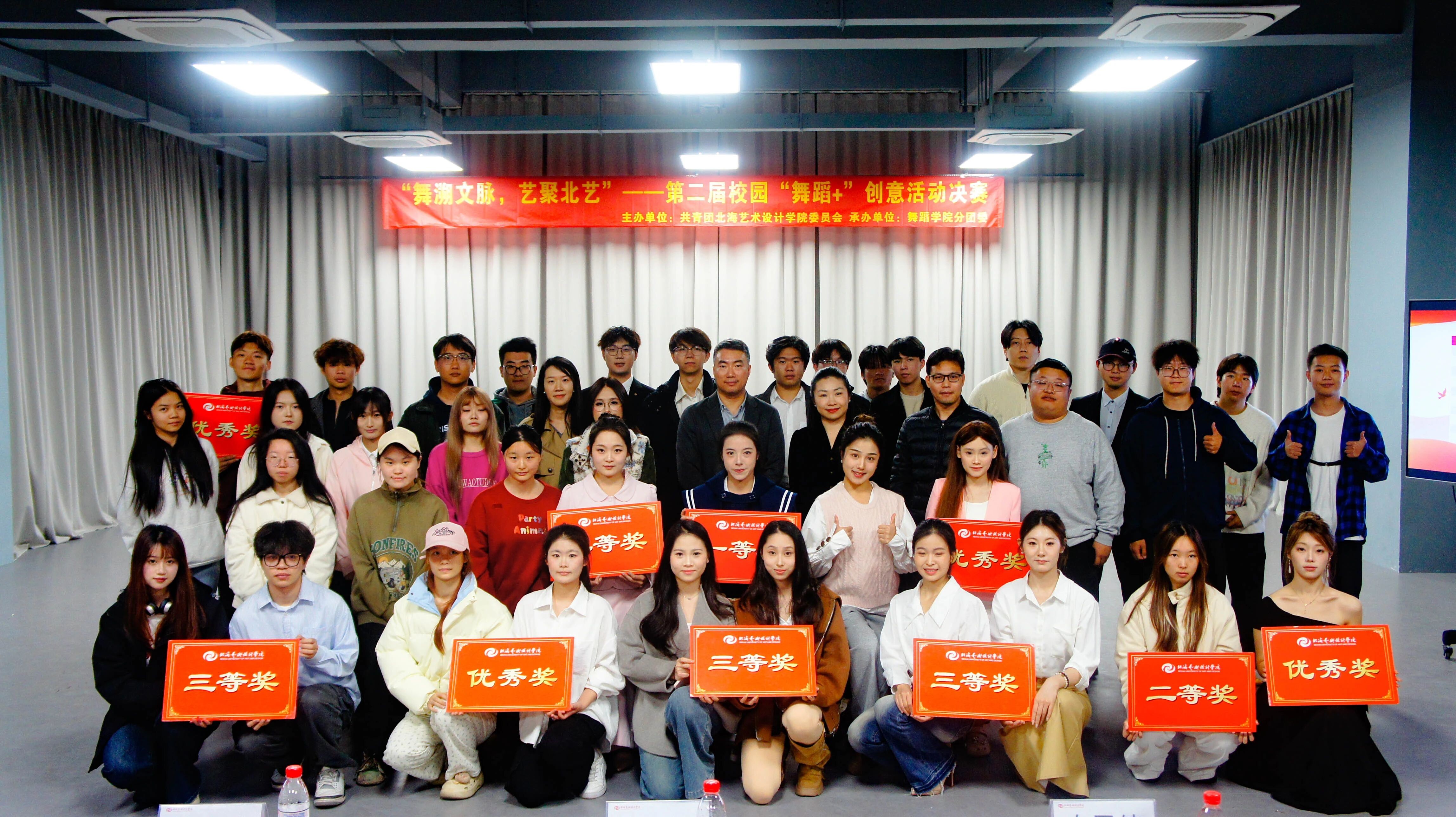 2025年12月26日,由共青团北海艺术设计学院委员会主办,舞蹈学院分团委承办的“舞溯文脉,艺聚北艺”第二届校园“舞蹈+”创意活动决赛在艺德楼313小剧场顺利完赛,舞蹈学院常务副院长邓欢、副院长李谦、书法学院副院长李家琪、北京实践基地副主任严腾等领导老师以及各专业学生来到现场观赛。舞蹈学院副院长翁梦蕾、建筑与环境艺术学院高级工程师,北海艺术设计协会会员农昌倩、舞蹈学院艺术教育教研室主任苏泽浩、美术学院摄影教研室专业教师何汝鑫、影视动画学院专业教师王弘武担任本次决赛的评委。
